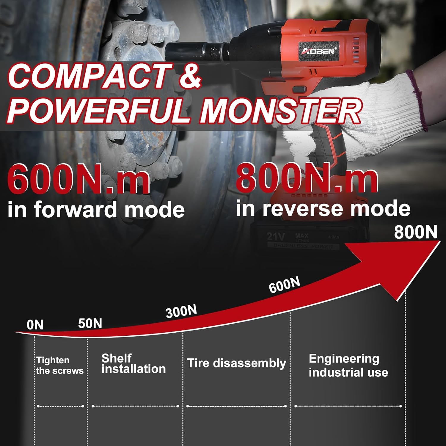 • 🛠【Compact & Powerful】AOBEN cordless impact wrench gets size, weight and performance well balanced. The compact design and LED light make it easier to get in tight and dark places; the powerful motor can deliver 600 N.m(450 FT/LBS) of max torque in forward mode, and 800N.m inreverse, max 3500 IPM impact rate and max 2400 RPM rotation speed. Save your time and effort during work.