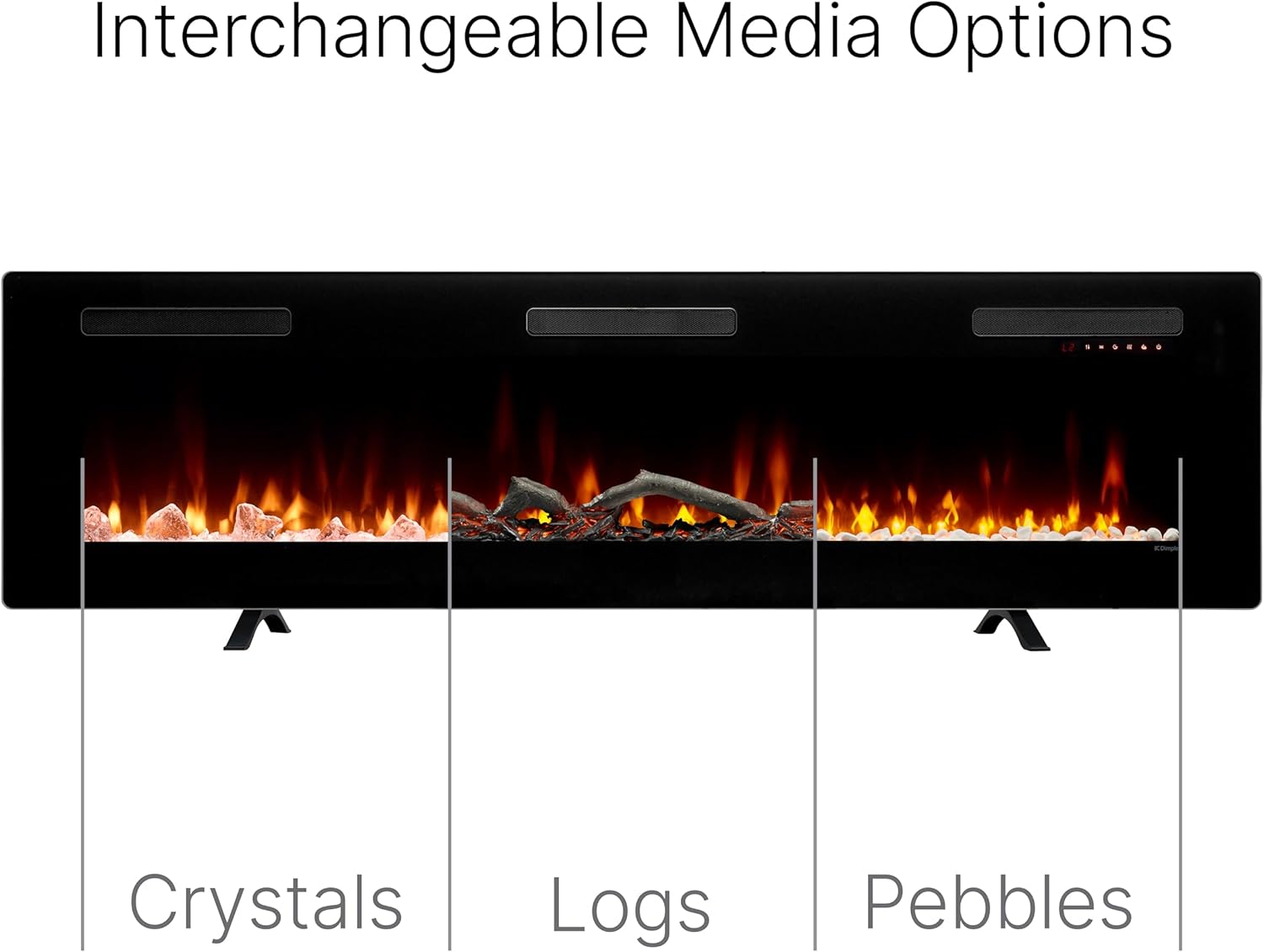 • Customizable Flame and Ember Bed: Switch between three media bed options—crystals, logs, or pebbles—and personalize the flame and ember bed colors. This electric fireplace lets you create a cozy, inviting atmosphere tailored to your style.