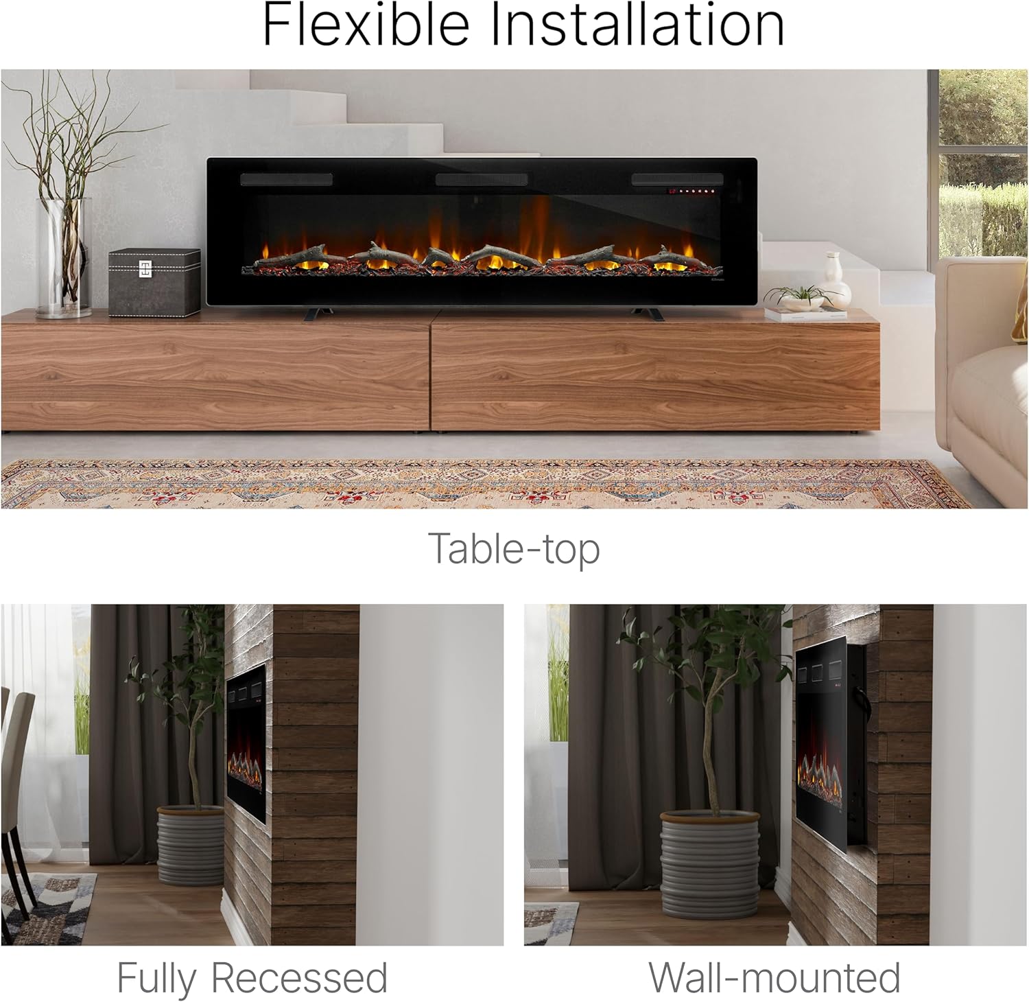 • Versatile Installation Options: The Dimplex Sierra 72″ Electric Fireplace offers seamless flexibility—mount it on your wall, use it as a tabletop fireplace, or recess it for a sleek built in fireplace look making it perfect for any room in your home.